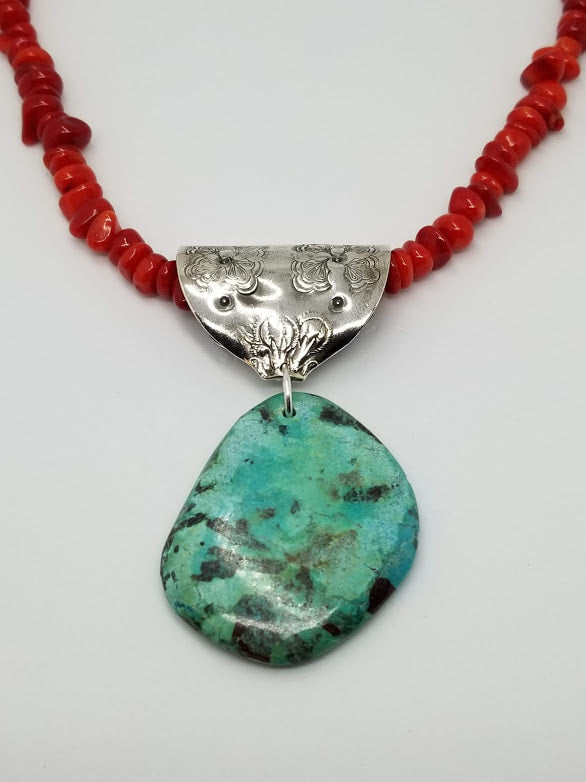Bohemian cowgirl chic is always in fashion! Red coral carries this stunning turquoise pendant. Hand forged fine silver toggle clasp, with a captivating hand made bail, formed out of a sterling silver spoon bowl and hand stamped. This riveting necklace is calling your name...