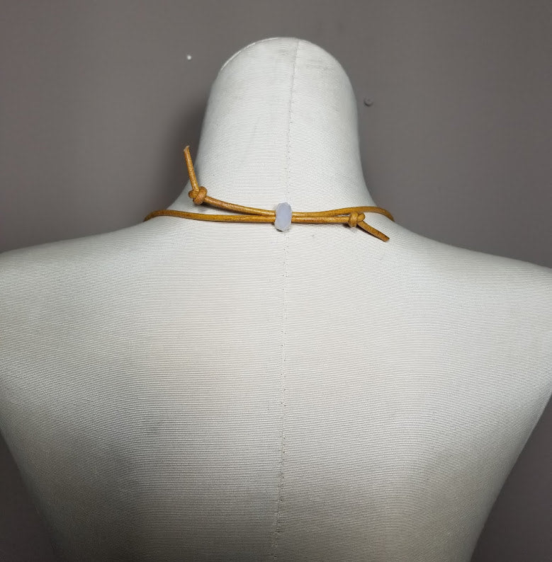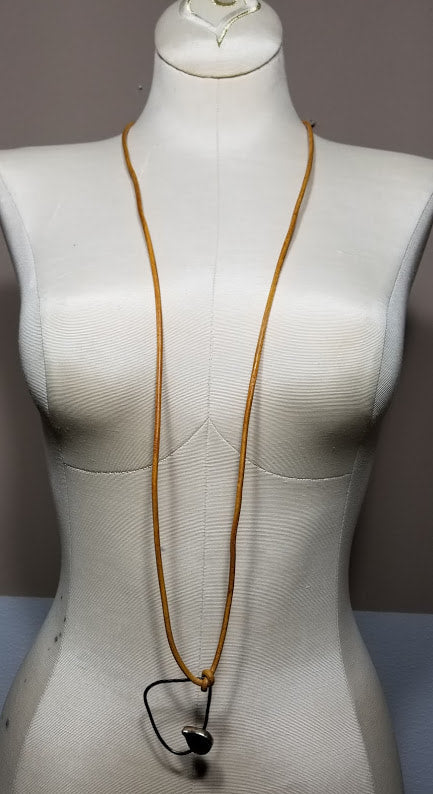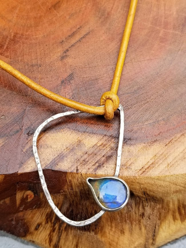 Soft mustardy genuine leather necklace, is completely adjustable with a hand forged, funky, sterling silver pendant and magical Labradorite gemstone. Perfect for any season or adventure. A sublime white glass, faceted slider bead does all of the work for your desired length.