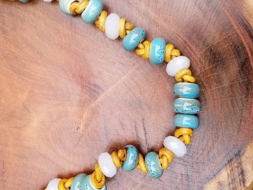 Genuine mustard yellow leather, hand knotted in between beautiful faceted white glass and blueish Raku ceramic beads. Large brass toggle clasp adorned with Amber crystals. Bring our your inner cowgirl.