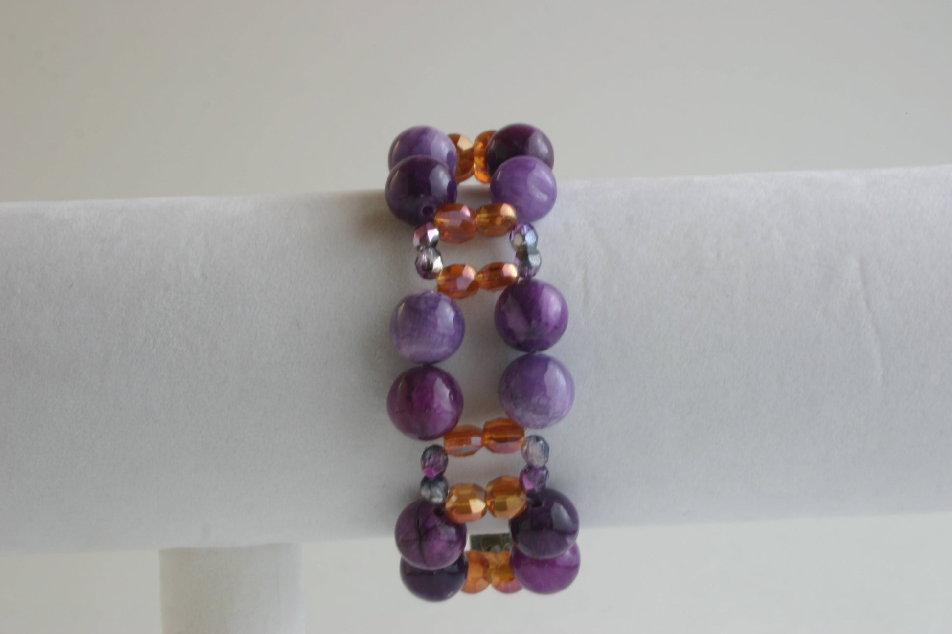 Handwoven bracelet with antique brass findings and stylish clasp, are coupled with dyed semi-precious Amethyst Jade and amber Czech beads. This will make you feel like a princess! Bracelet measures 7 and 3/4 inches end to end. 1/4" shorter when clasped.