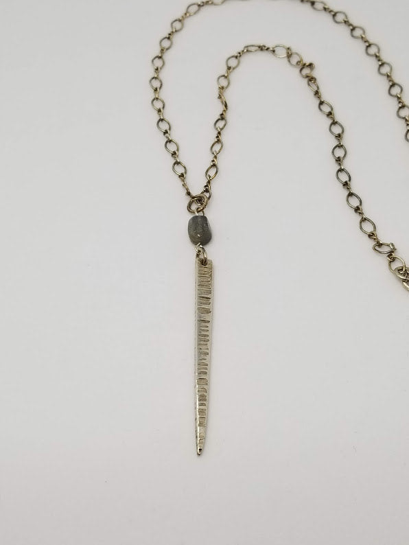 This upcycled sterling silver fork tine was hand sawn, hand stamped, drilled and paired with a Natural Labradorite gemstone. It sits upon a lovely sterling silver chain and sterling lobster clasp.