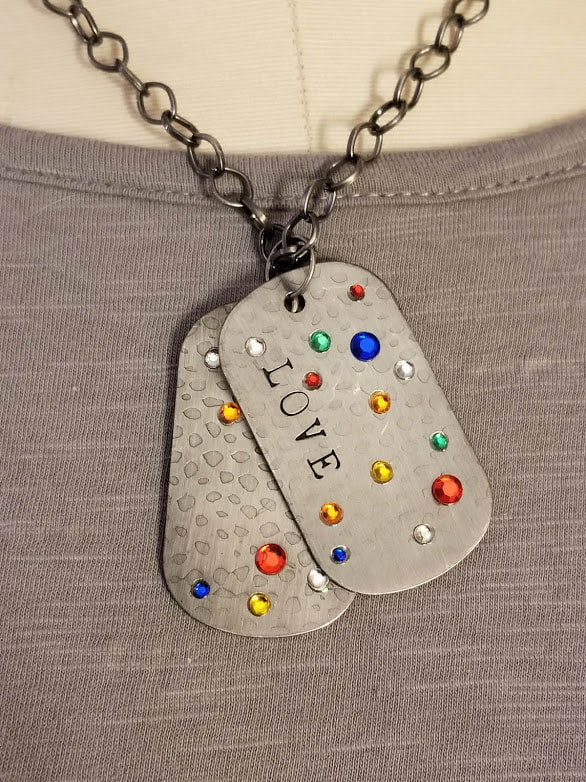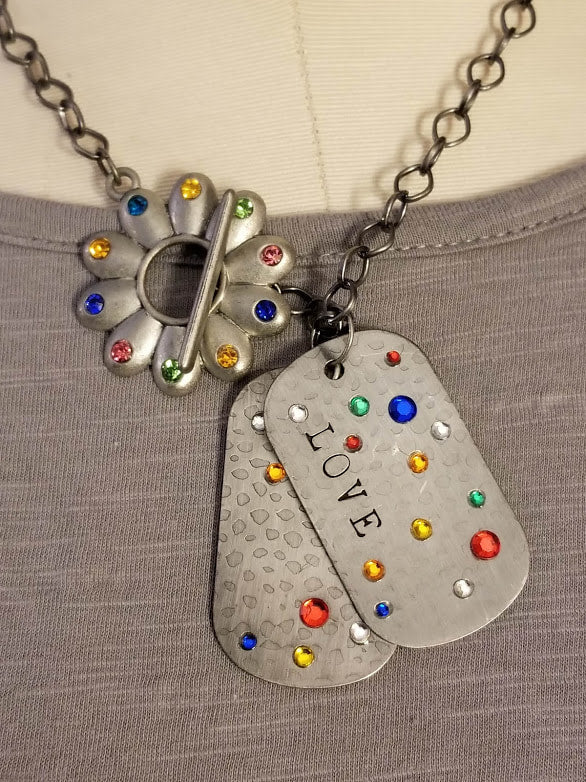 Oxidized silver plated metals make up this riveting LOVE necklace. Stamped with the single word "LOVE" and surrounded by multi colored crystals with two dangling dog tags and featuring a flower toggle clasp, mimicking the playful crystals on the tag pendants. Grab her up!