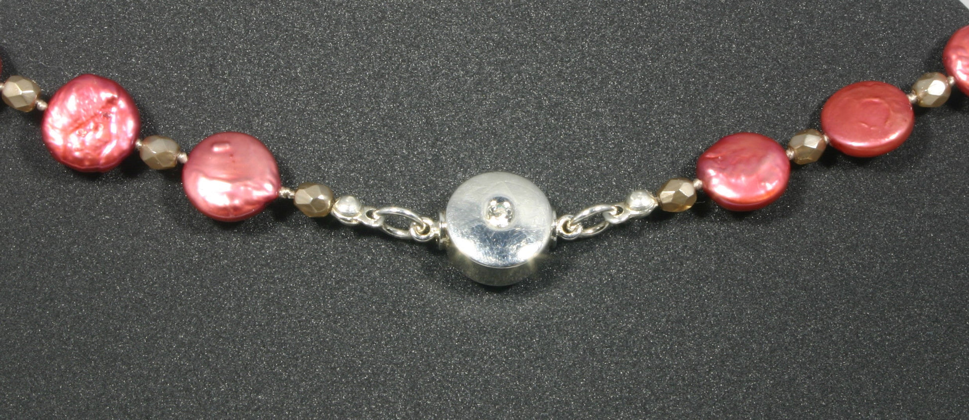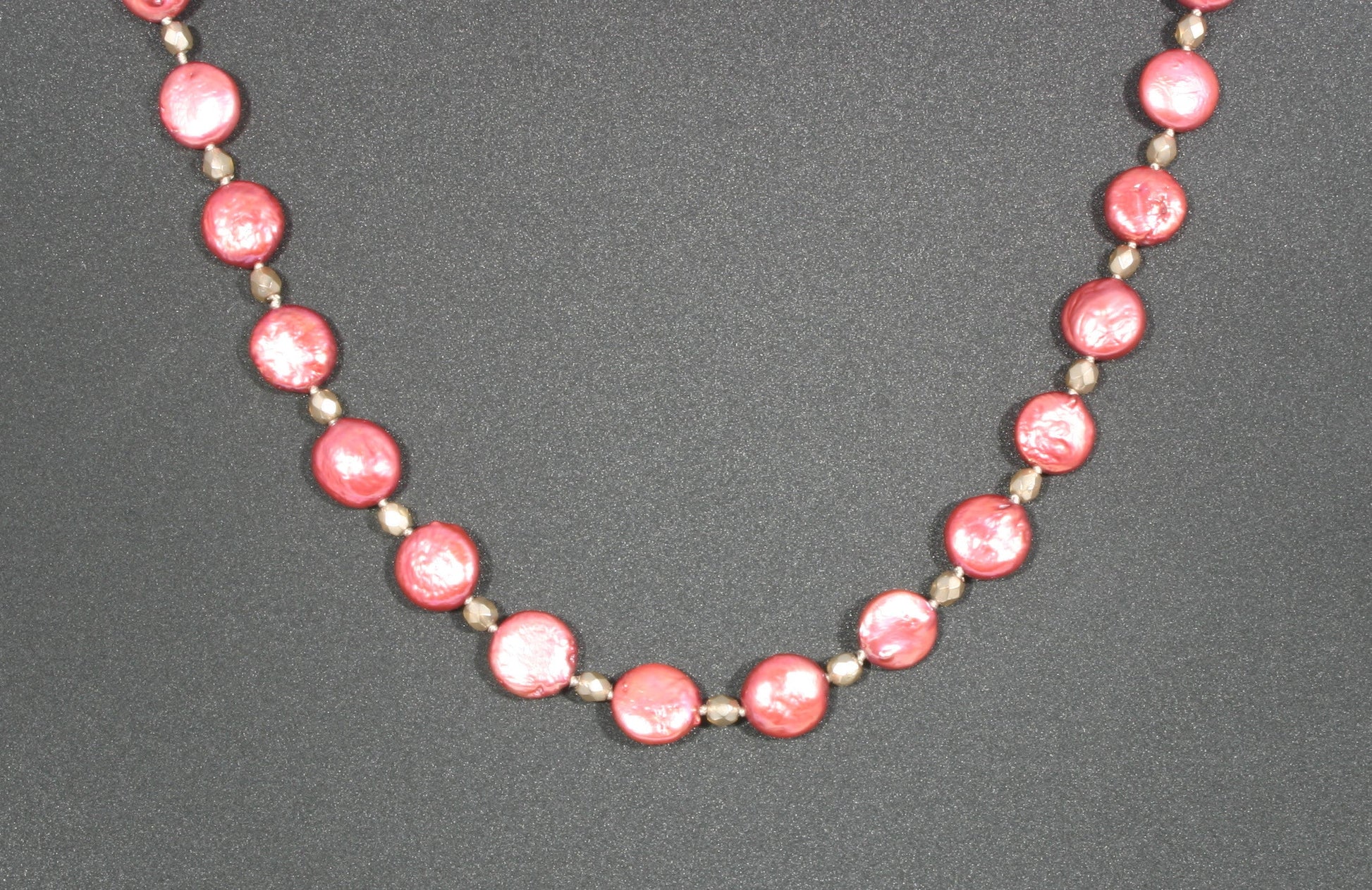 Smaller dyed, high quality, luminous freshwater coin pearls are mixed with light brown Czech fire-polished glass beads and hand knotted with 100% silk. Sterling silver findings and a silver plated magnet crystal clasp can be worn front or back for a unique look. (Matching bracelet is available and you can buy as set. See Bracelets menu). Truly magnificent!!!