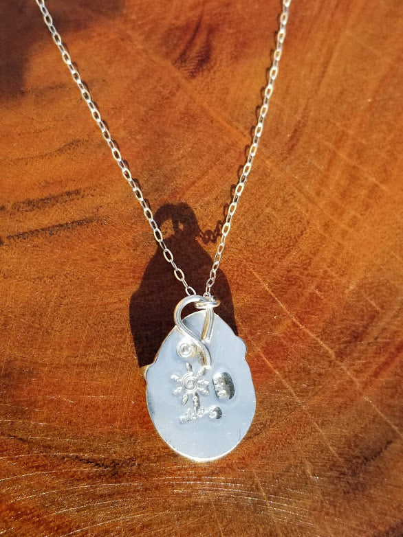 Hand forged, sterling silver Ruby pendant, with a fun half bezel, prong setting, that actually makes it look like she's smiling. (I want all of my customers to smile when they wear something I created). It's truly beautiful and just the right size for layering or by herself.