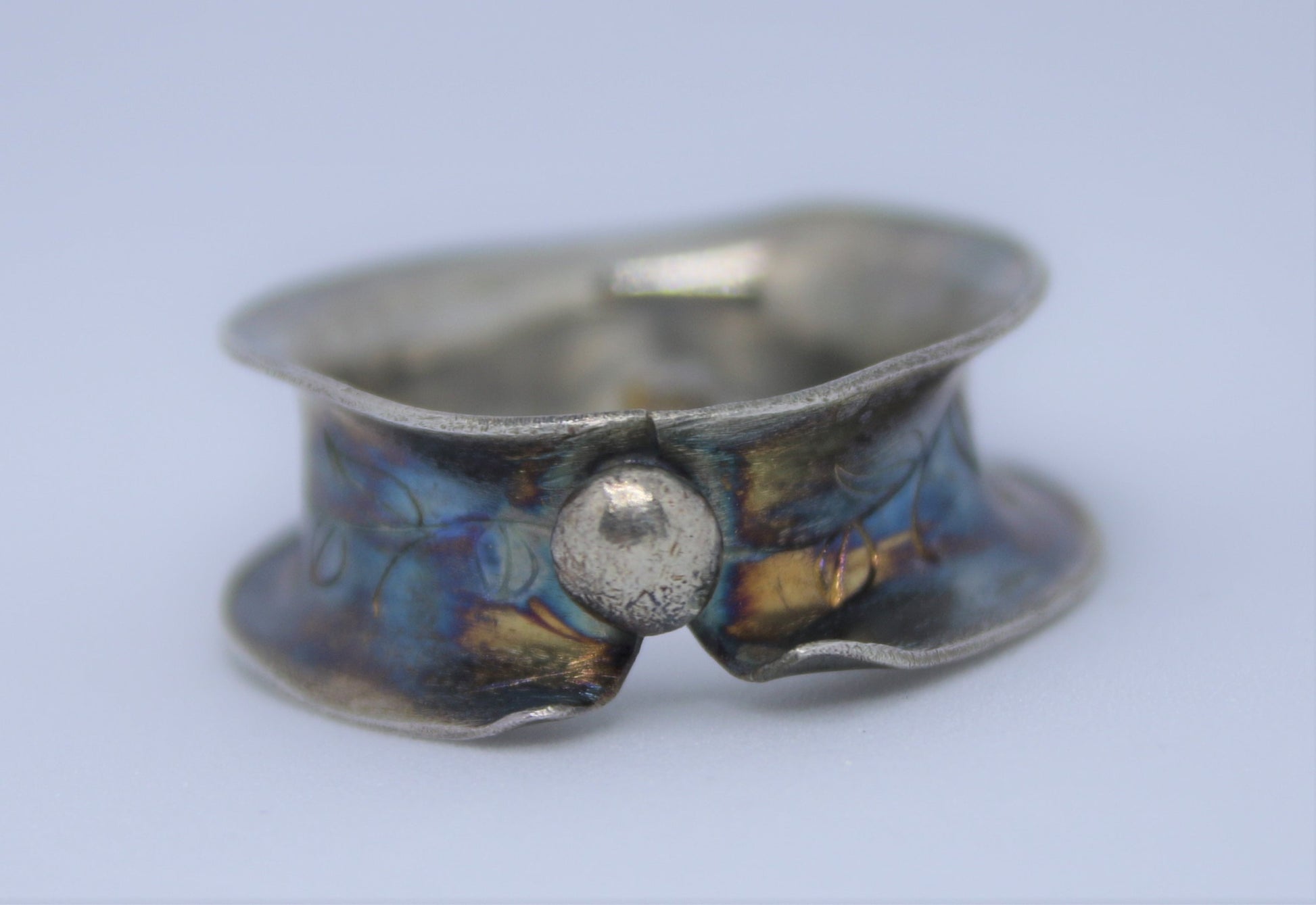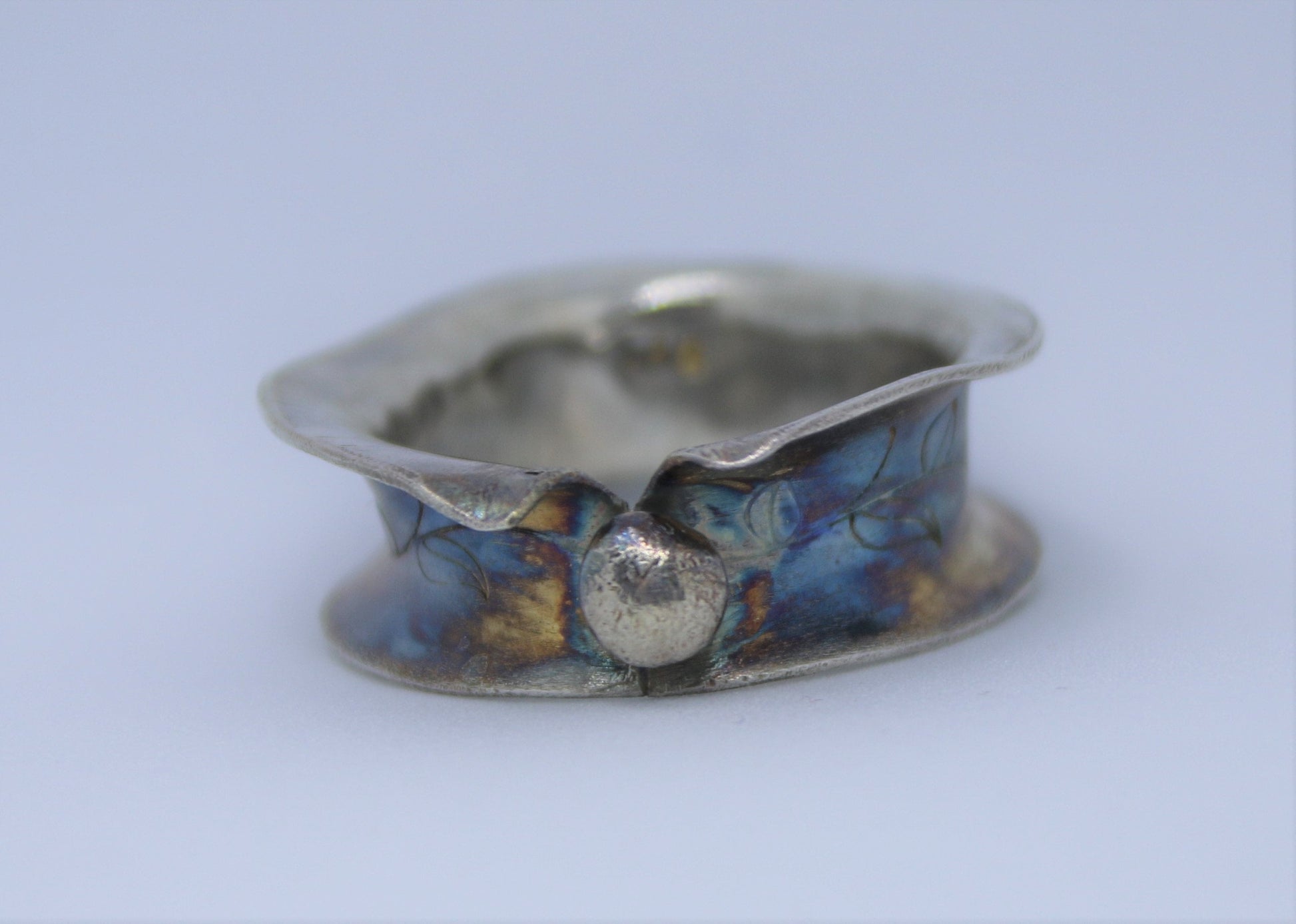 Hand forged anticlastic sterling silver ring. A rich, colorful patina sits on the inside where you'll find a hand stamped vine all the way around and a sterling silver embellishment in the front, giving this much desired ring extra character. Size 8 & 1/2