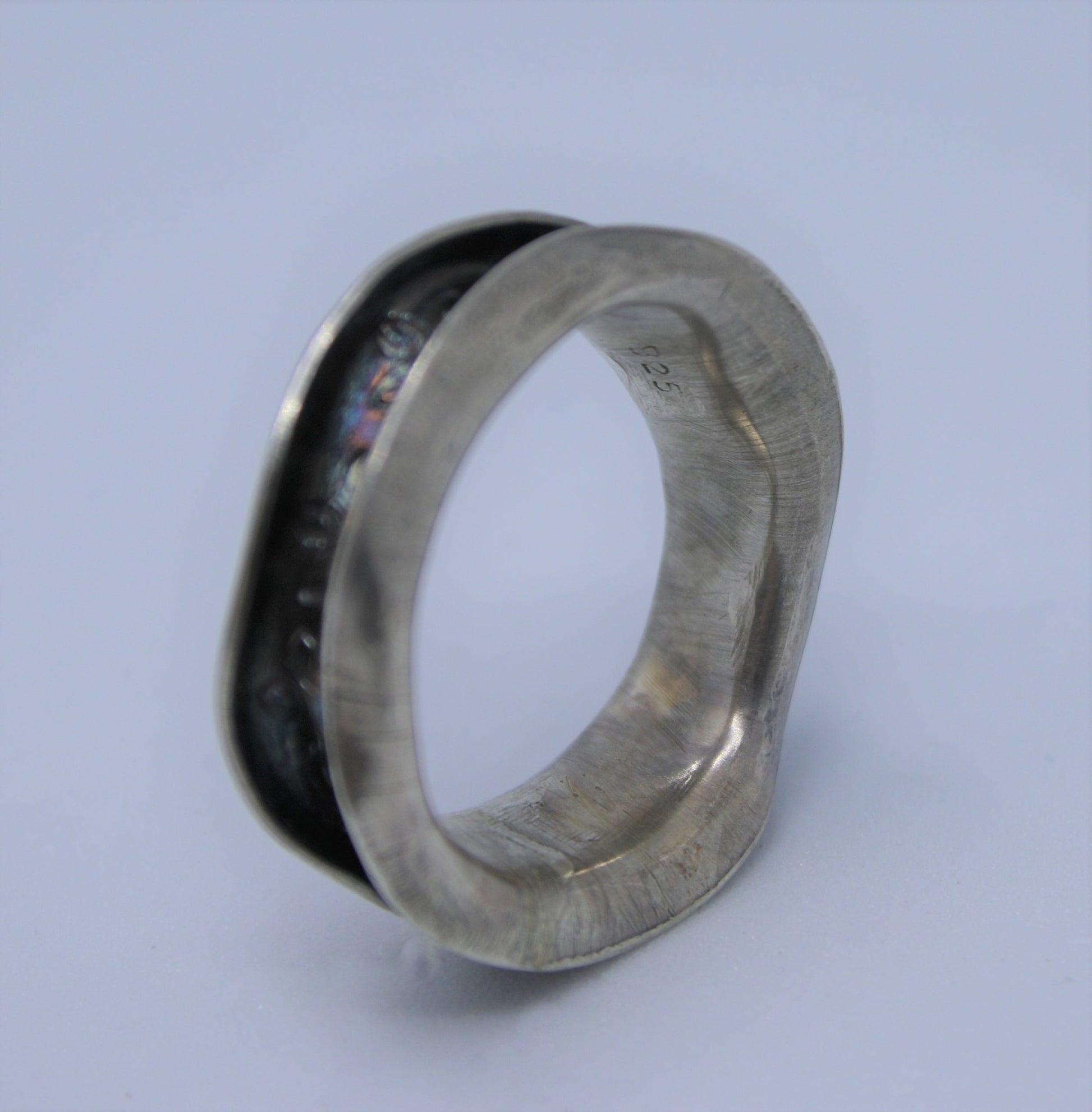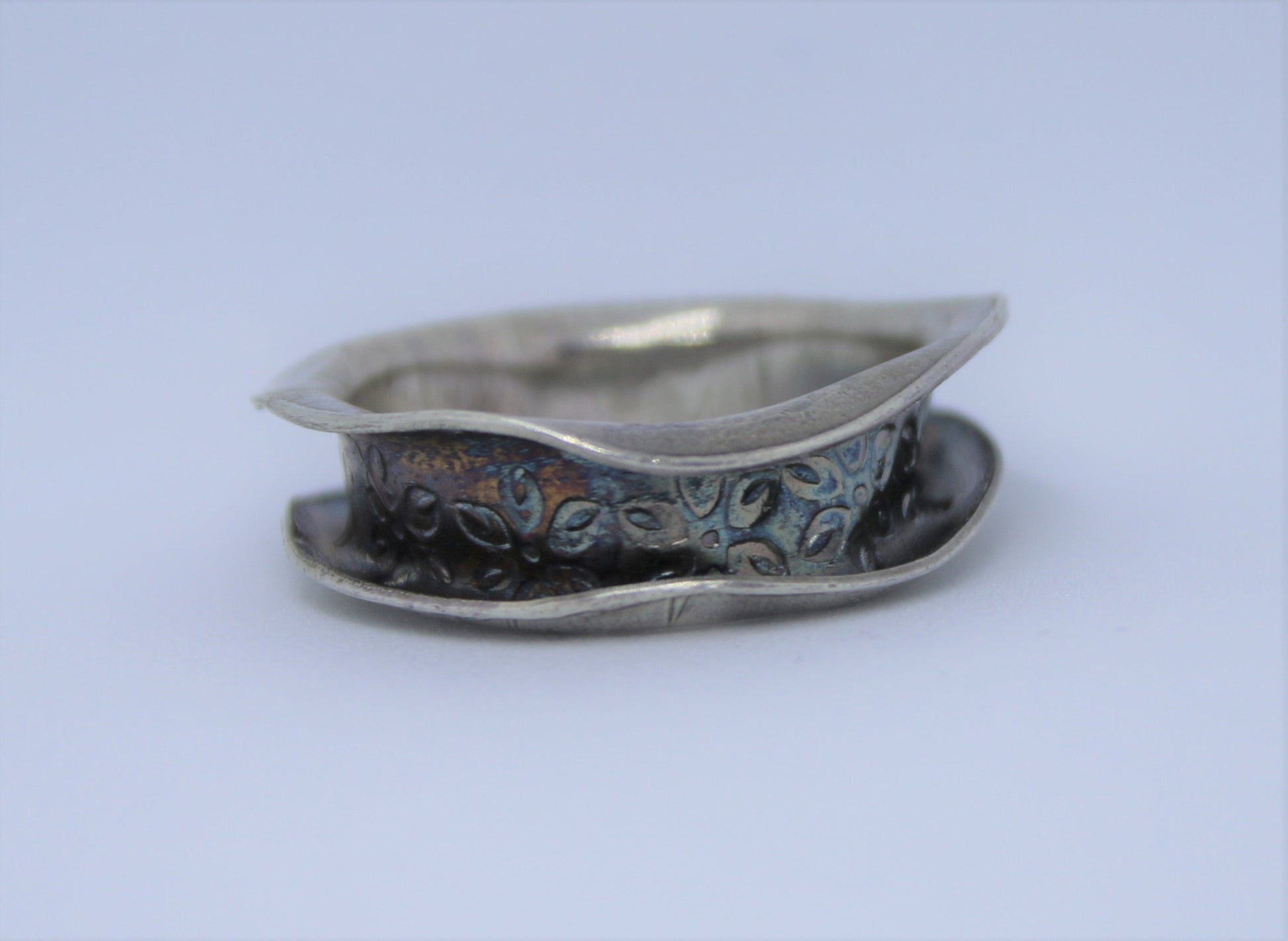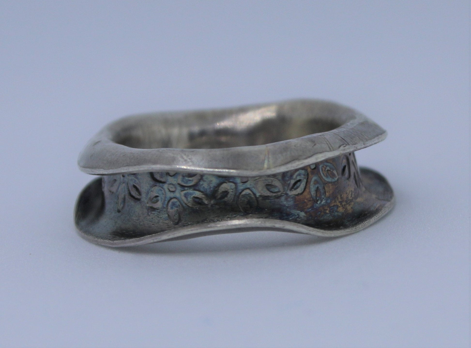 Hand forged anticlastic sterling silver ring. This one has a very cool patina look and is hand stamped with flowers on the inside. Comfortable and pretty lightweight. Size 6 & 1/2