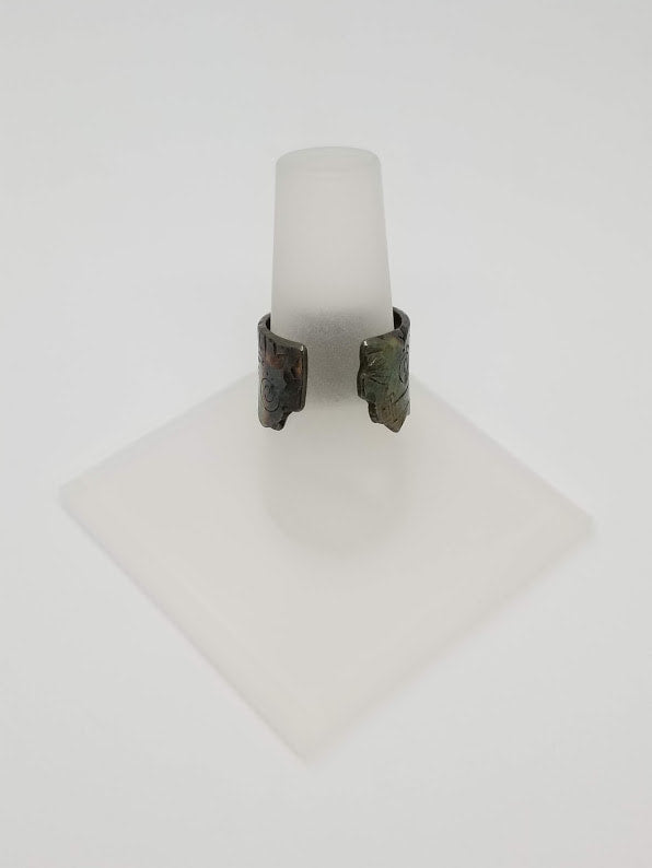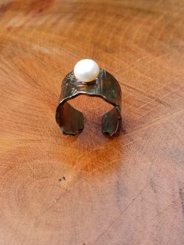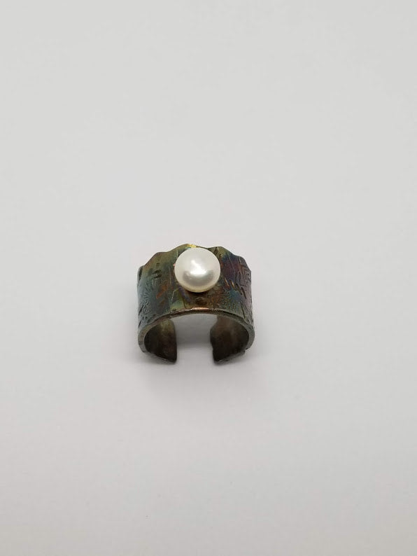 Solid, hand forged, sterling silver ring that was heavily textured, hand sawn out of sterling sheet and forged into this rugged piece of wearable art. The patina was then applied in such a way to create the rainbow of colors around the silver. A freshwater button pearl lay atop this open ring band to complete this fairy tale ring. Size 7 and is slightly adjustable.